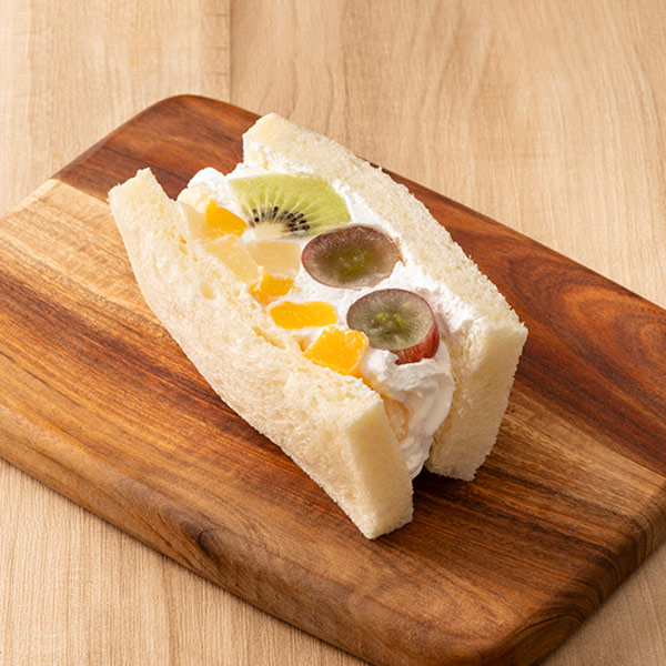 洋梨と黄桃のフルーツクリーム、キウイ、赤ぶどうを、ミルキーなホイップクリームでサンドしました。